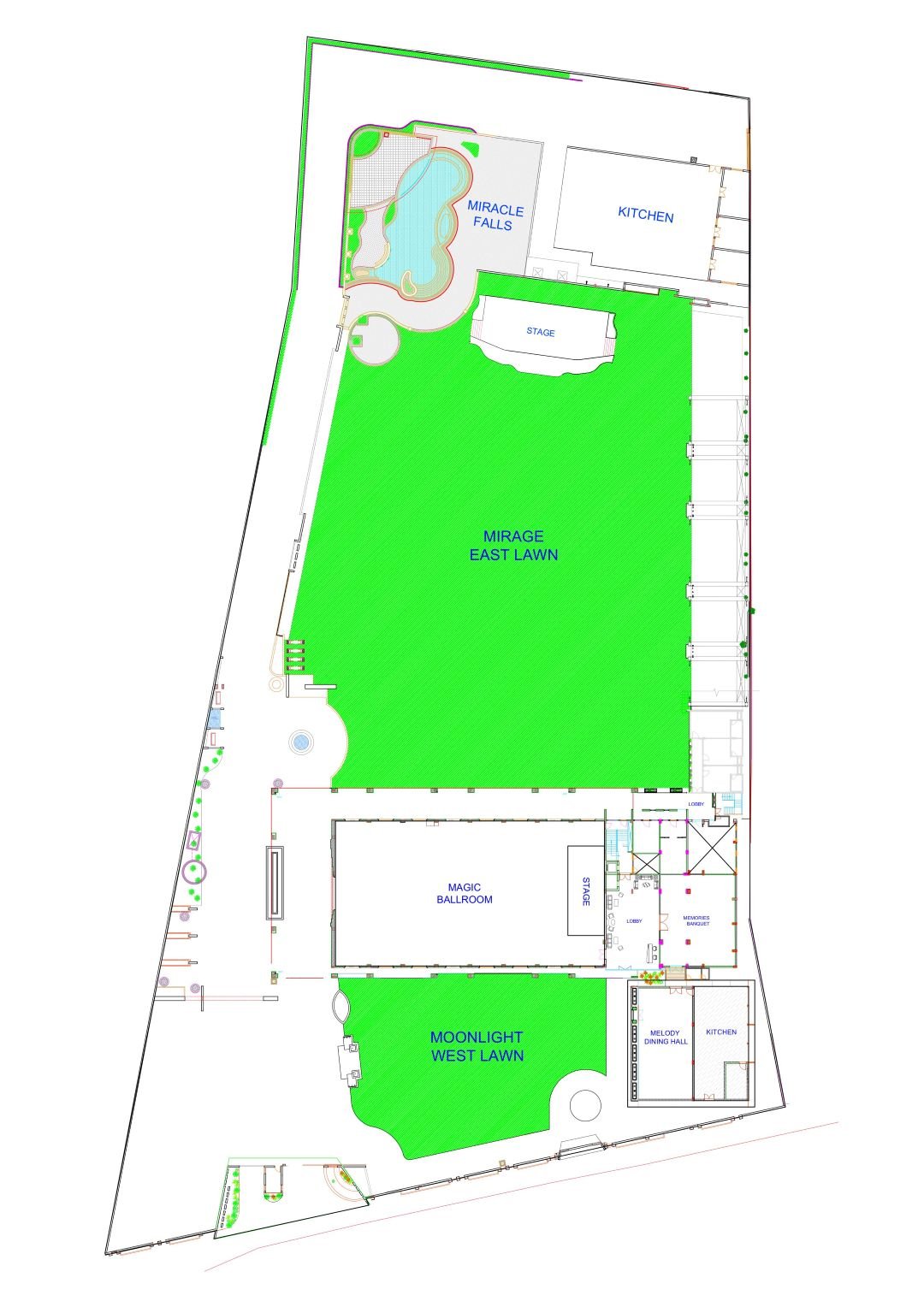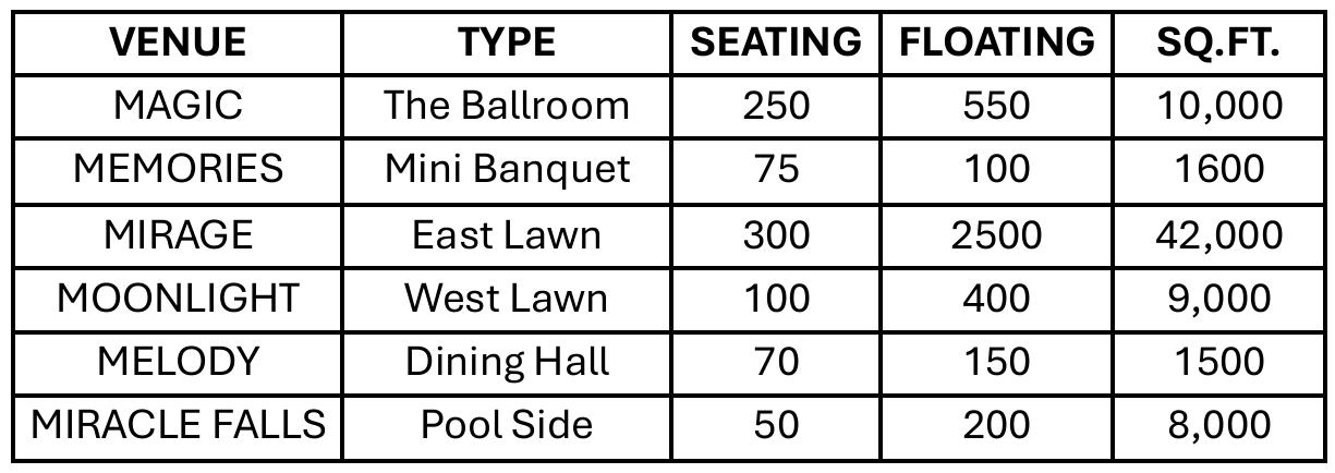 Discover the versatility of Miracle Resort through our detailed layouts and blueprints. Visualize how each venue can be customized to fit your unique vision, from grand ballrooms to serene outdoor lawns. Experience the beauty and functionality of our spaces before your event even begins.